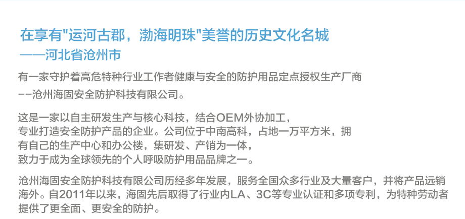 滄州海固安全防護科技有限公司,是一家以擁有自身獨創品牌與自主研發核心科技,結合OEM(代加工)產品授權生產,專業打造安全防護產品的企業。專業的研發團隊掌握關鍵核心技術負責設計和開發新產品,靈活整合各類資源渠道,嚴格的產品質量把控和完善的售后服務,已經使海固公司一躍成長為國內專業的安全防護用品定點授權委托生產廠家及個人呼吸防護用品科技研發中心。