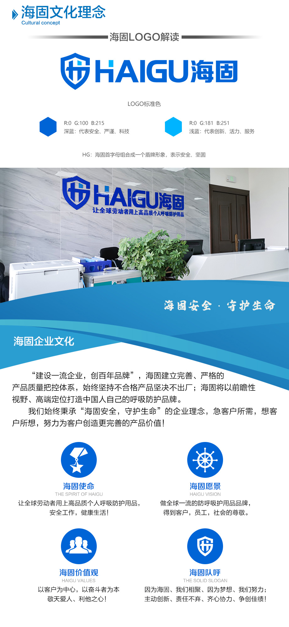 海,廣納百川,盾,固守安全,是海固理念的精髓體現。我們致力于用大海的胸懷引領個人呼吸防護用品行業的發展方向,以盾的堅固作為防護用品研發的核心理念,為用戶提供科學專業、有針對性的PPE個體安全防護方案,追求成為具有國際化水準的職業防護解決方案供應商。