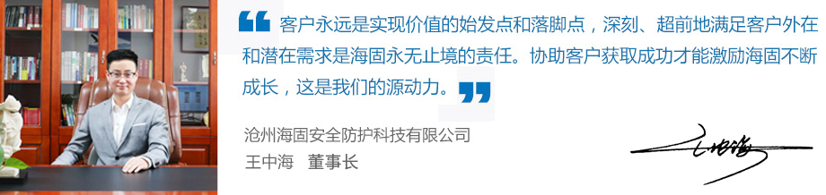 "建優質企業,創百年品牌",海固建立完善、嚴格的產品質量把控體系,始終堅持不合格產品堅決不出廠;銷售過程中提供專業精準的技術服務,為每一位客戶量身定做符合工作需求的防護方案。同時,海固公司植根本土,放眼國際,以創新性前沿科技不斷提升企業競爭實力。