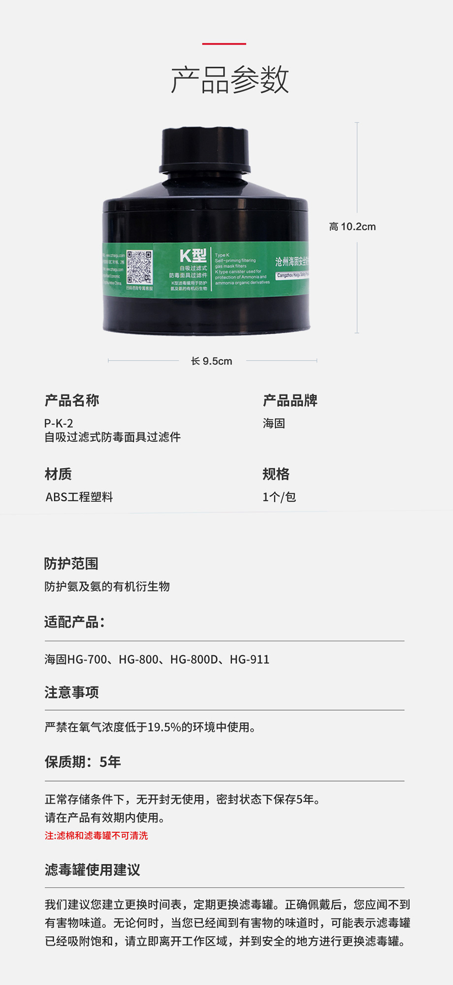 海固P-K-2級濾毒罐 氨及氨的有機衍生物防護