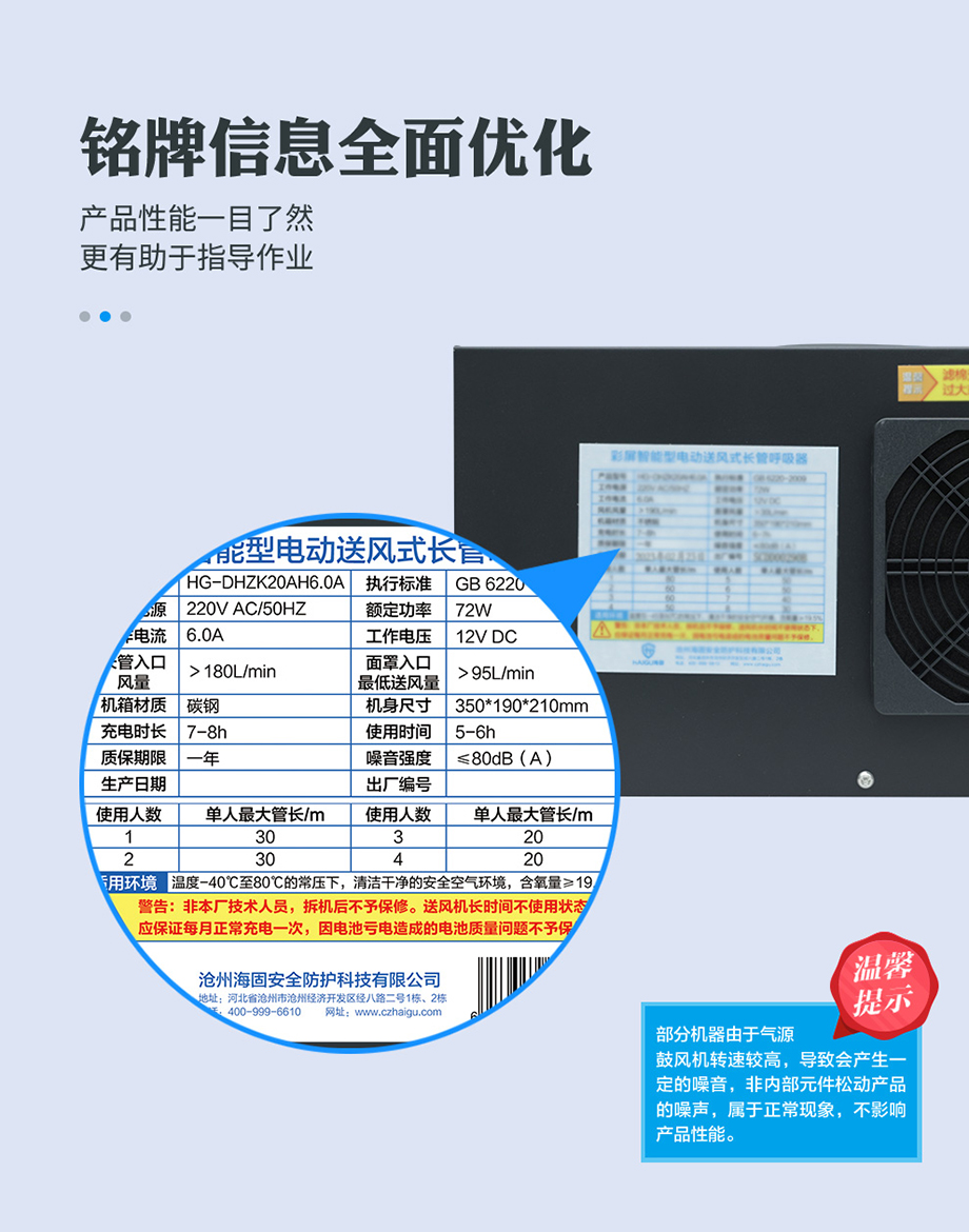 海固HG-DHZK20AH6.0A智能型彩屏 半面罩 單人電動送風式長管呼吸器