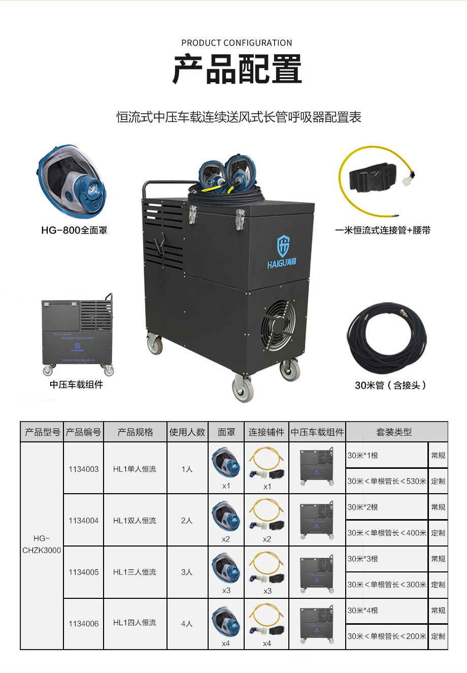 海固HG-CHZK3000 全面罩 恒流式中壓車載連續(xù)送風(fēng)式長管呼吸器